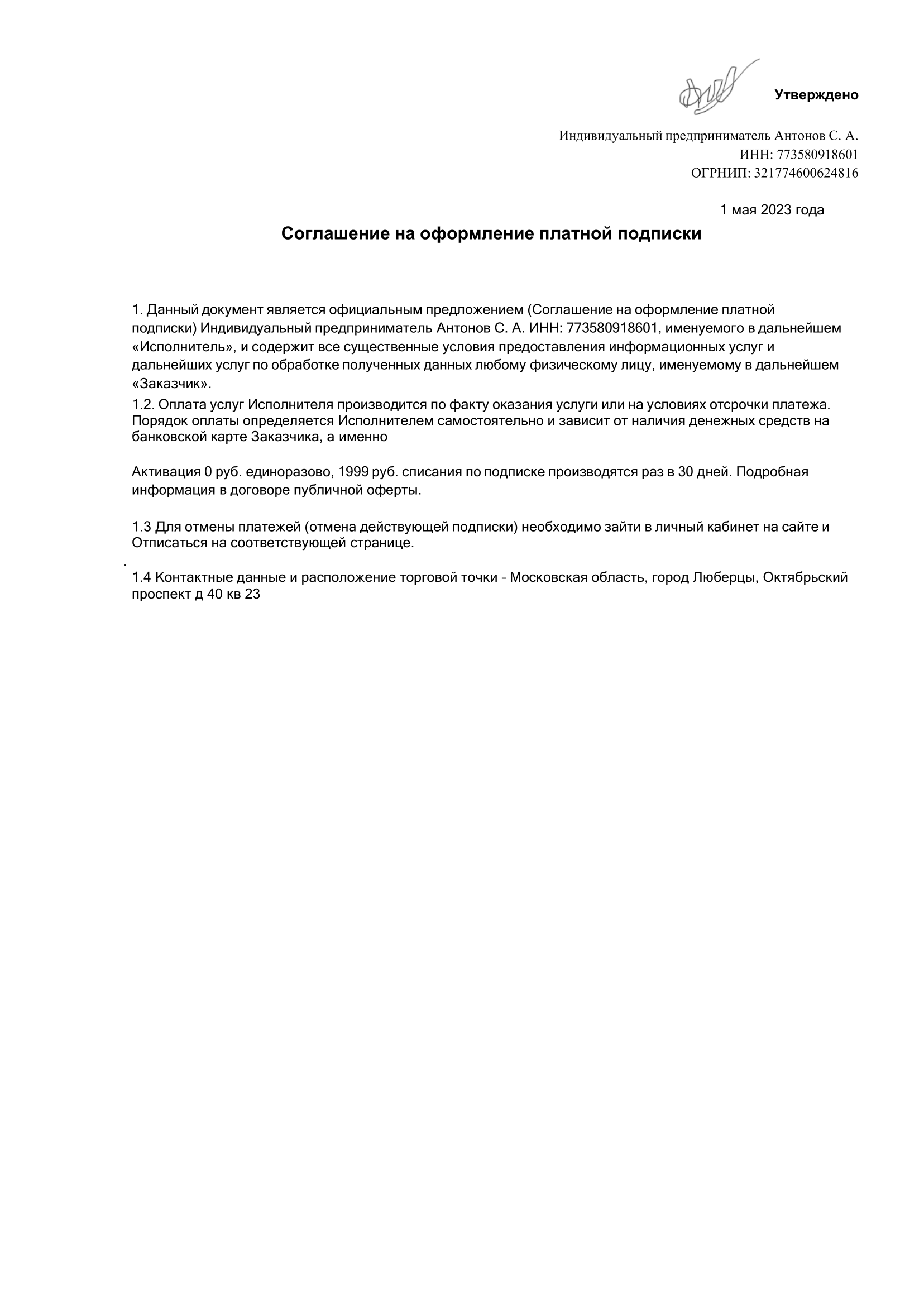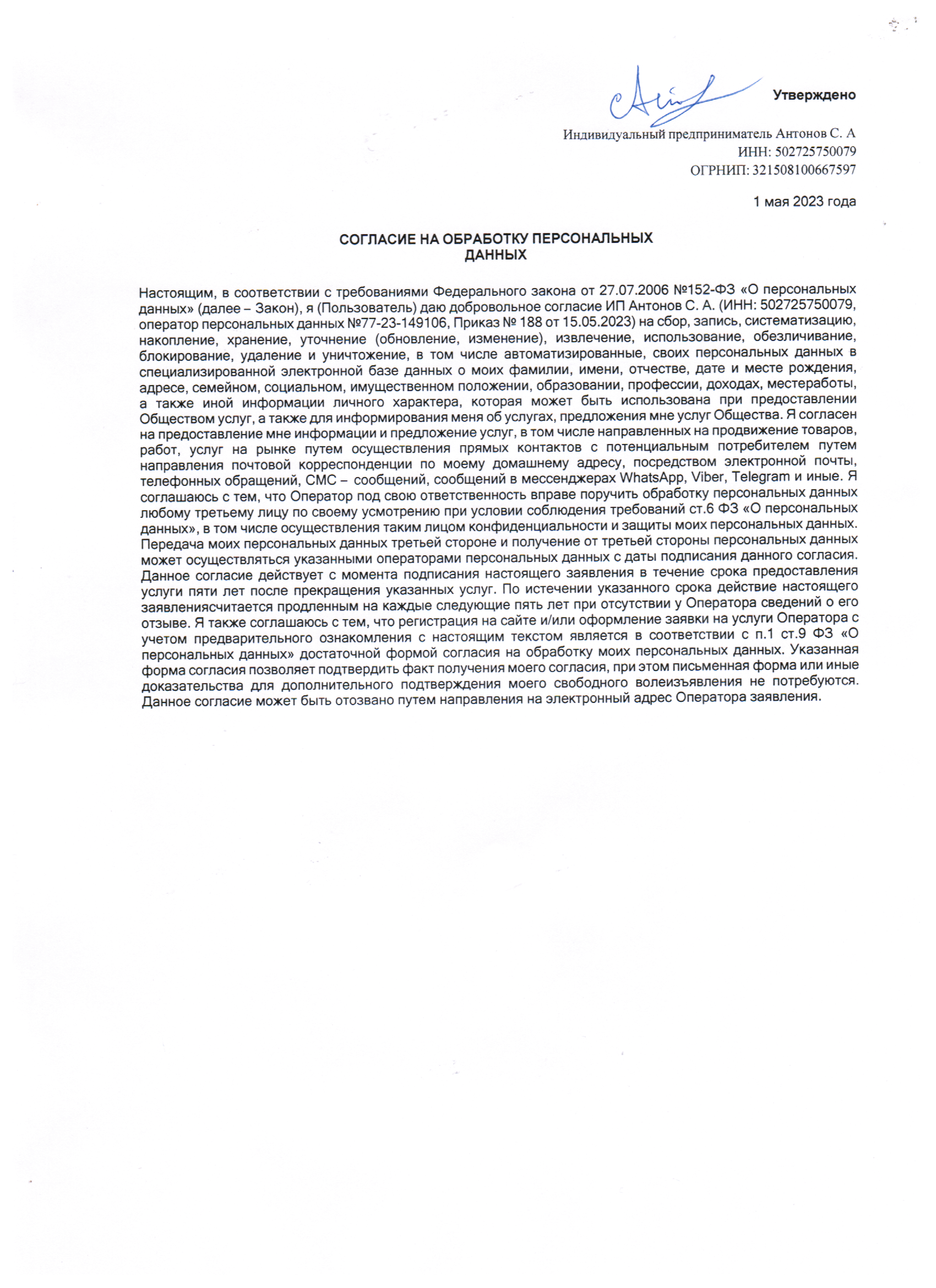 ИП Антонов Сергей Александрович является оператором персональных данных под номером 77-23-149106 Приказ № 188 от 15.05.2023.